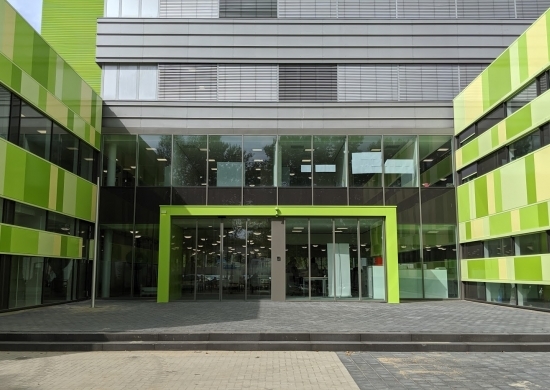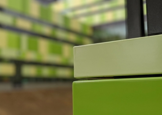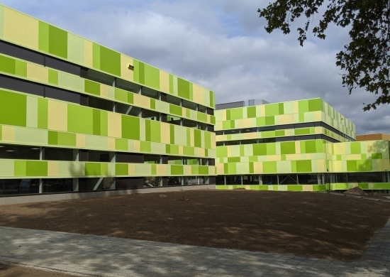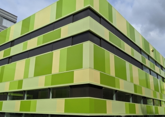 Die gelbgrünen Fassadenplatten sind mit einer Alesta® SuperDurable Architecture Pulverlack, glänzend glatt versehen. Folgende Farben wurden angewendet: