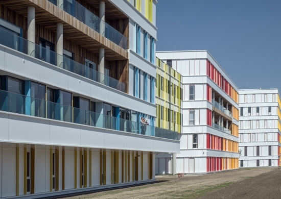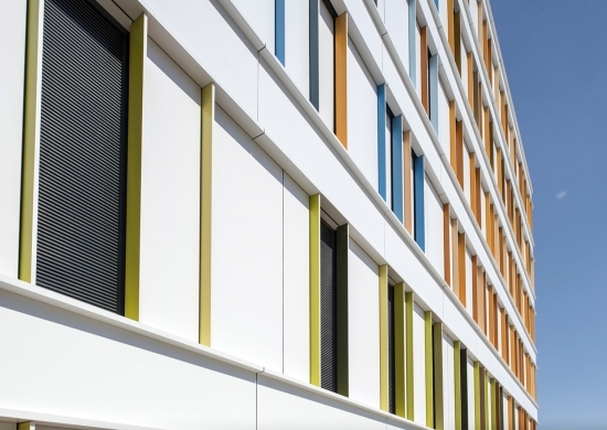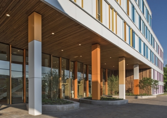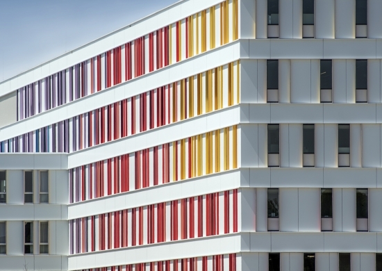 Die Farbe wurde durch die Assoziationen bestimmt, die ein Krankenhaus hervorruft. Die weiße Fassade verweist auf die weißen Kittel des Pflegepersonals. Die farbigen vertikalen Streifen erinnern an die farbigen Strichcodes, mit denen Genetiker arbeiten. Das Gebäude strahlt dank der vielen Farben Optimismus und Wärme aus. Das passt perfekt zu einem Gebäude, bei dem Kind und Familie im Mittelpunkt stehen.