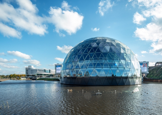 Die Kuppel ist in mehrere horizontale Ringe gegliedert, wobei die einzelnen Ringe ein Dreieck-Muster zeigen. Mit einem Durchmesser von 42 Metern und einer Höhe von 21 Metern ist die Kuppel ein echter Blickfang. An jedem Knotenpunkt wird je ein Licht-Spot nach innen und nach außen gerichtet. So bietet die Kuppel auch abends einen faszinierenden Anblick. Für die innere Betonkuppel des Theatersaals ist eine Begrünung mit Pflanzen vorgesehen..