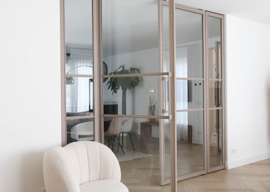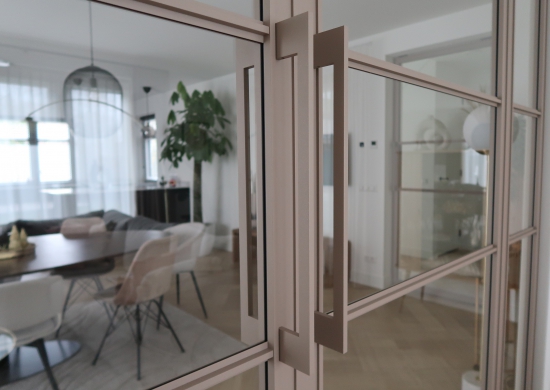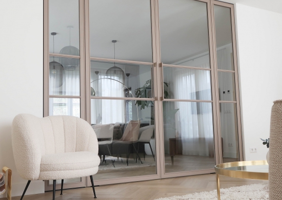 Auffallend ist die Verwendung markanter Materialien wie Holz und Leder in Kombination mit einem edlen Finish. Die Türen können nach Ihren eigenen Wünschen zusammengestellt werden. Metallic Gold, Champagne oder Bronze? Oder vielleicht eine anthrazitgraue oder weiße Drehtür mit Hochglanz-Verarbeitung? Mit der Anwendung der EUROLACKE Pulverbeschichtungen sind alle Farbkombinationen möglich.