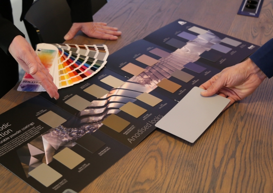 Die ausgewählten Farben für die Aluminiumrahmen passen zu den unterschiedlichen HPL-Platten. Wir haben darauf geachtet, dass mehrere Kombinationen möglich sind. Darüber hinaus haben wir ausführlich die Funktionalitäten der ausgewählten Pulverlacke in Bezug auf Farbton- und Glanzhaltung besprochen.
