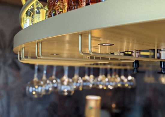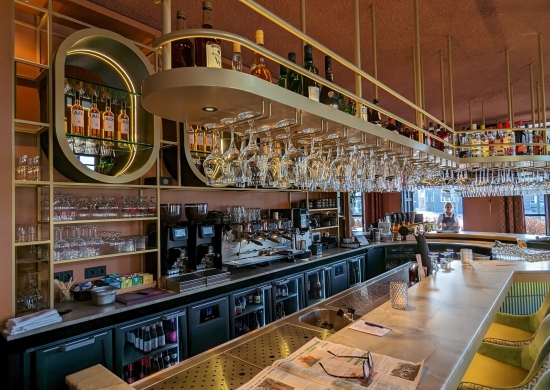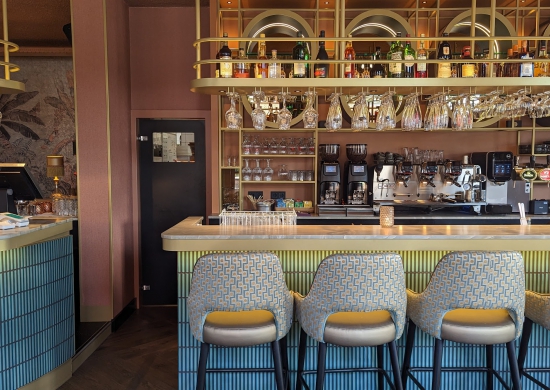 Das neue Interieur lässt sich am besten als Hotel-Chic beschreiben; eine Mischung aus romantischen Einflüssen kombiniert mit einem luxuriösen Erscheinungsbild. Neben der Verwendung sanfter Farben und Materialien wie Samt spielen Goldelemente und Accessoires eine große Rolle. Die goldenen Elemente kommen hier auf vielfältige Weise zum Einsatz. Vom Barelement, Getränkeregal bis hin zu den Namensschildern.