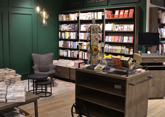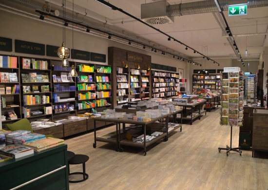 Das neue Geschäft bietet auf rund 700 Quadratmeter Fläche ein barrierefreies Stöber- und Einkaufsvergnügen. Unzählige Bücher, gemütliche Leseecken, ein Kaminzimmer, das Abenteuerland für Kinder und das Caféfenster mit Flanierblick runden das Wohnzimmer-Gefühl ab.