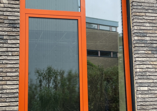 Um die Fensterrahmen und Vorhangfassaden einzufärben und zu schützen, entschieden sich die Architekten von Broekbakema für eine Pulverbeschichtung in der Farbe RAL 2001 (AE7001-2200120) in einer seidenmatten Ausführung. Ein ausdrucksstarker, warmer Farbton, der in Kombination mit dem dunklen Stein der Fassade besonders gut zur Geltung kommt.