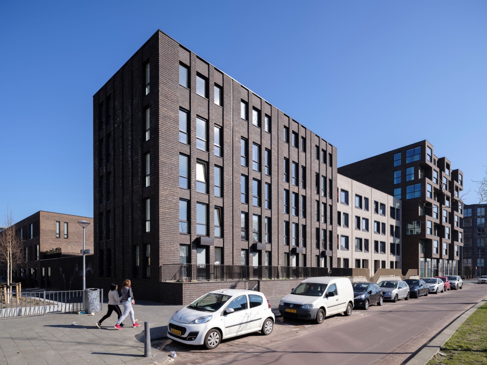 Das Projekt umfasst 61 Wohnungen, davon 33 Stadthäuser, 8 Herrenhäuser und eine kompakte Apartmentanlage mit 20 Mietwohnungen und 1 Gewerbefläche. Die sorgfältige Detaillierung der Gebäude und die abgestimmte Material- und Farbpalette sorgen für ein klares Gesamtbild. Das Mehrfamilienhaus bildet einen schönen Höhenakzent.